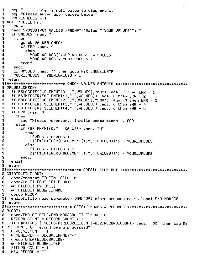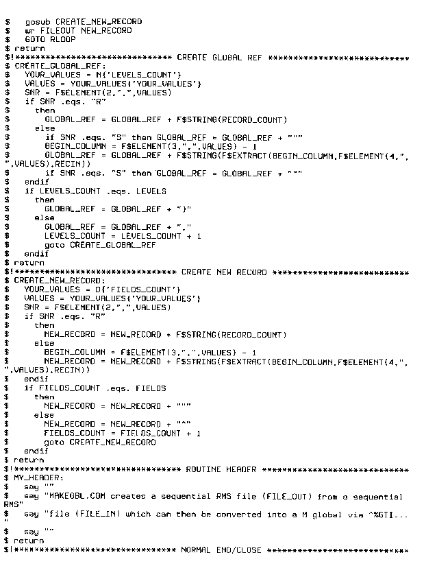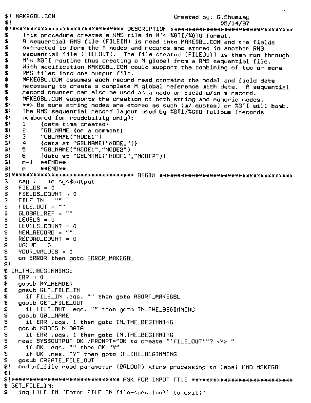 The following sample DCL script, MAKEGBL.COM, was written for a national HMO. From a sequential RMS field delimited file, MAKEGBL creates another RMS sequential file in M's %GTI format. MAKEGBL enables the creation of a M global of the user's design from any sequential RMS field delimited file.