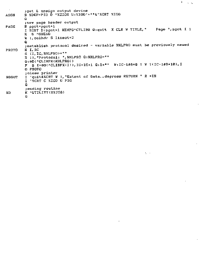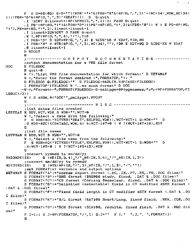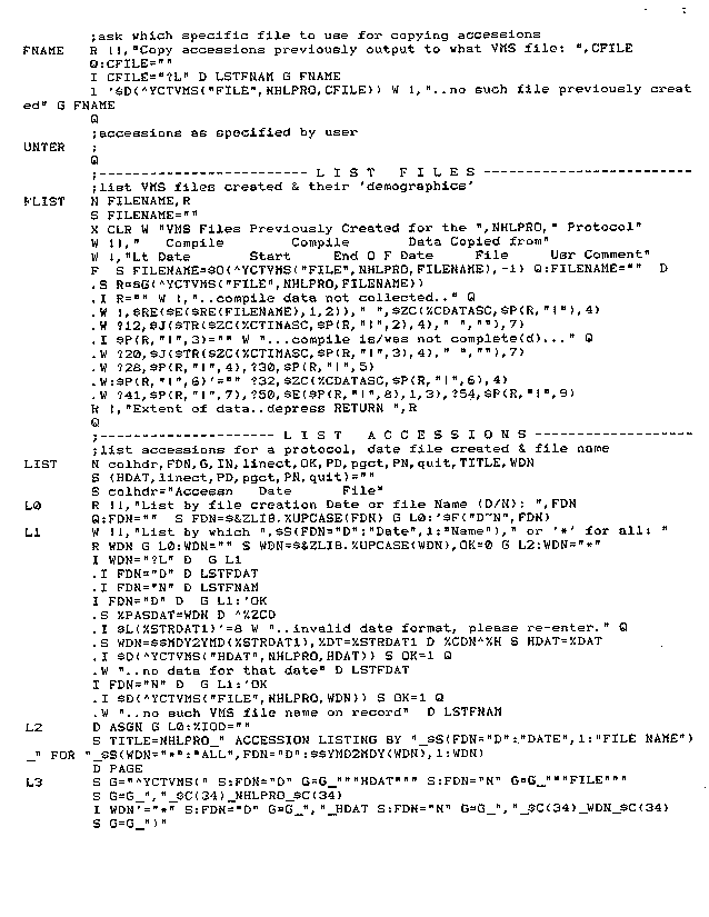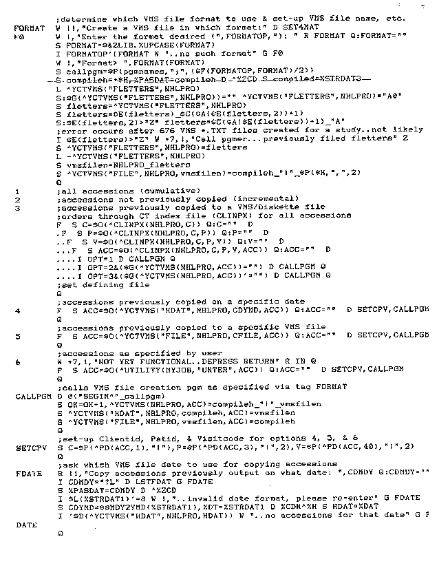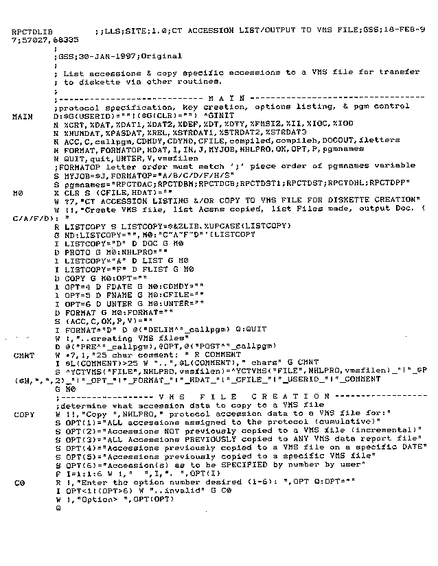 The following sample M[UMPS] routine, RPCTDLIB, was written for a national clinical laboratory. RPCTDLIB lists lab accessions and copies selected accessions to a VMS file for future electronic transfer.